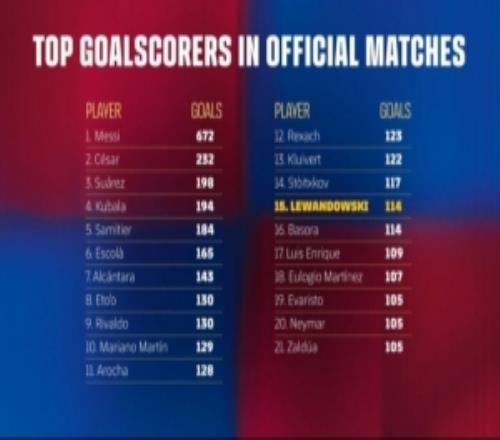 莱万为巴萨打进114球,队史射手榜上追平巴索拉并列第15