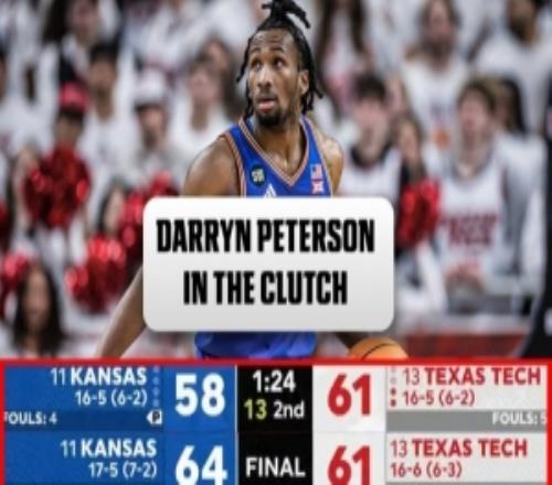 体育播报2月3日宣 NCAA常规赛,堪萨斯大学以64-61逆转德克萨斯大学。此役,堪萨斯大学状元热门达林·彼得森出战...