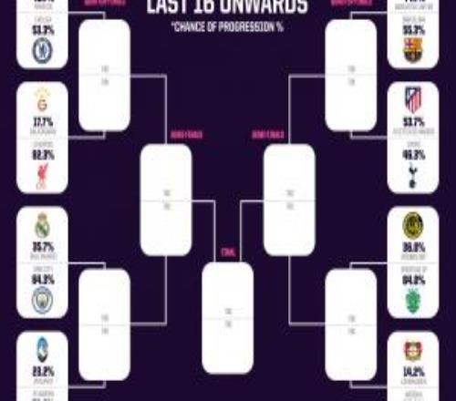 体育播报02月27日宣 OPTA超算对欧冠1/8决赛进行了10000次模拟,各组对阵晋级概率如下。OPTA超算1/8决赛晋级概...
