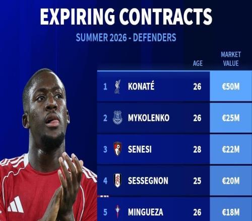 德转列今夏合同到期的十大后卫:科纳特、斯通斯、津琴科在列