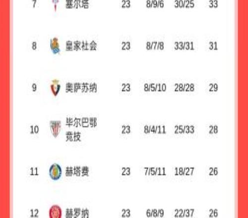 体育播报02月10日宣 西甲第23轮,除了延期的比赛未战,本轮其他赛事全部战罢。23轮后,西甲的积分榜各个阶段划分...