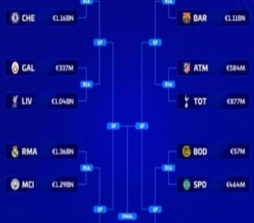 德转列欧冠16强对阵身价:上半区6队超9亿、下半区仅巴萨和阿森纳