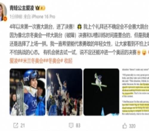 体育播报2月15日宣 谷爱凌更新社媒,谈到晋级米兰冬奥会自由式滑雪女子大跳台决赛的感受。米兰冬奥会自由式滑...
