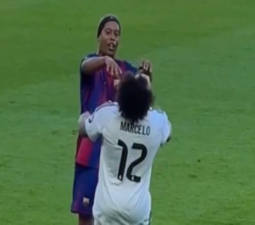 体育播报2月23日宣 国家德比传奇赛,罗纳尔迪尼奥开玩笑推倒马塞洛。巴...