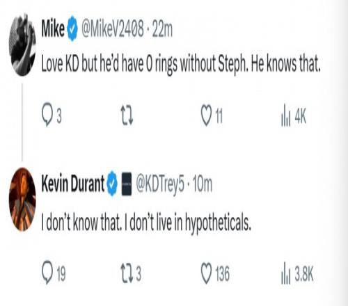 网友:爱杜兰特,但没有斯蒂芬·库里他一枚戒指也拿不到。他自己心里清楚。