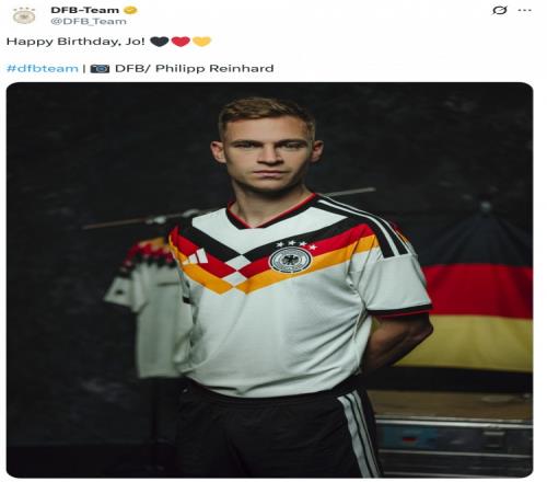 德国队社媒晒出基米希身穿国家队球衣的照片,配文:“生日快乐,约书亚!”
