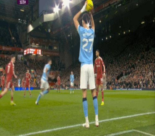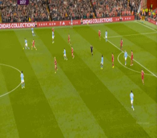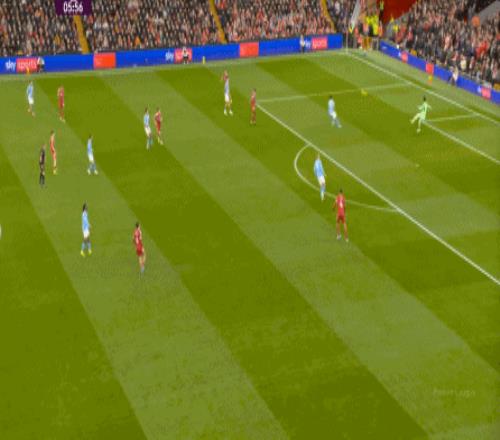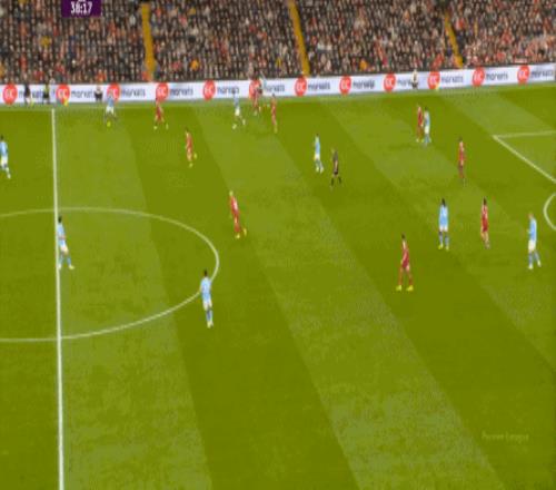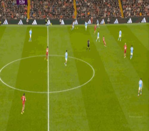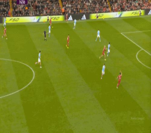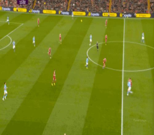 当然了,利物浦的进攻威胁程度和曼城还是没法比,萨拉赫的确不负当年之勇,但埃基蒂克和维尔茨也没有什么像样的表现,所以曼城很快重新掌握大局,在第33分钟,用利物浦的失误和自身的跑位,带着维尔茨的罗德里在右路送出了传中: