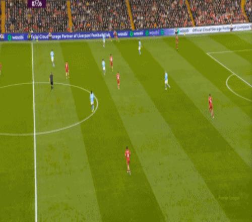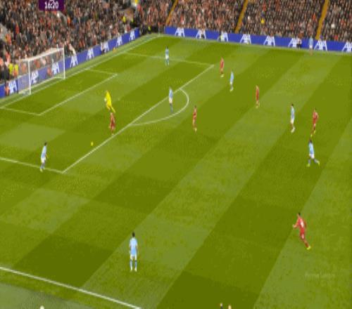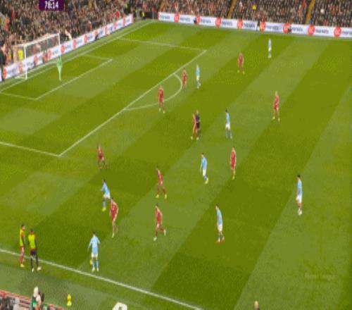 这在战术上不会有特别明显的变化,所以曼城的表现并未立刻改善,于是在第73分钟,利物浦在由左至右的转移过程中打出进攻,随后在二点争夺中制造了定位球: