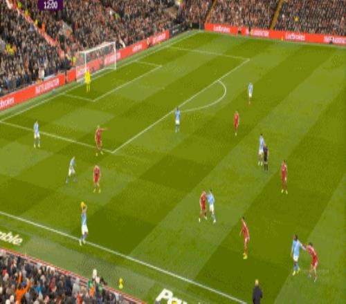 而在利物浦高位逼抢下的传中没有形成机会之后,曼城发动反击,这一路上,利物浦多次助攻,让曼城还是完成了禁区外的远射起脚: