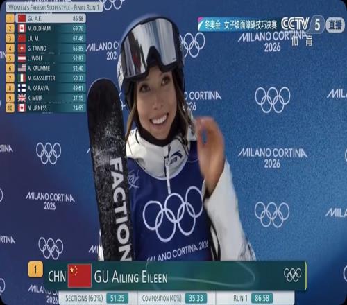 第11个出场的谷爱凌决赛第一次滑行,最后一个空翻完美解锁1260高难动作,腾空舒展、落地稳准,整套动作一气呵成丝滑到极致。最终得到86.58的高分!