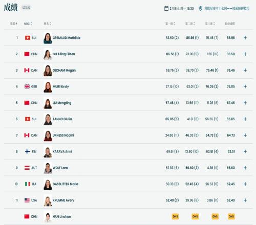 三位中国选手中,刘梦婷第2位出场,韩林杉第8位出场,谷爱凌第11位出场。该项目的卫冕冠军瑞士选手玛蒂尔德·格雷莫德最后一位出场。