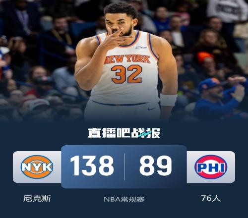 一开场,尼克斯率先发力打出16-5的开局,76人不断冲击内线拿分苦苦追赶,尼克斯内外开花扩大优势,次节尼克斯持续发力,布里奇斯和唐斯联手高效输出,一举将分差拉开到30分,半场战罢尼克斯72-42领先76人。下半场,76人进攻回暖,但尼克斯稳扎稳打牢牢占据场上主动,末节尼克斯一度将分差拉开到52分。最终,尼克斯138-89狂胜76人,客场过关。