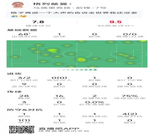 体育播报2月13日宣 在国王杯半决赛马竞对阵巴萨的比赛中,格列兹曼破门,以下为他在本场数据:
