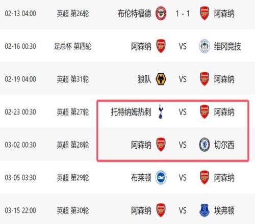 根据赛程安排,本周阿森纳将出战足总杯,下周中则提前进行第31轮的比赛,届时他们将做客对阵狼队,相信只要正常发挥,阿森纳大概率能拿到3分。不过之后阿森纳将面临2场恶战。第27轮比赛,阿森纳就将做客对阵热刺,之后将回到主场迎战切尔西,短短7天之内,阿森纳要进行2场德比大战。其中热刺刚刚换帅,下周末在主场肯定会死磕阿森纳,阿尔特塔的球队随时又会丢分。至于切尔西,他们正抢分争四,同样不会让阿森纳轻松获胜,这2场比赛一旦出现意外,阿森纳将面对巨大的压力。