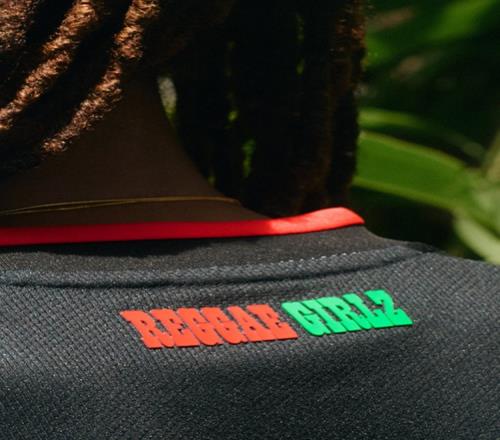 深色底色上布满了受声波、黑胶唱片甚至老式卡带卷轴启发的线条图案。衣领处的“Reggae Boyz/Girlz”(雷鬼男孩/女孩)标签也受到了马利唱片公司Tuff Gong所用字体的启发。此外,使用金色的经典三叶草标志完美地点缀了整体设计。