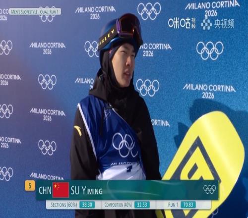 体育播报02月15日宣 米兰冬奥会单板滑雪男子坡面障碍技巧预赛第2轮,中国选手苏翊鸣获得72.78分,超过他此前第...