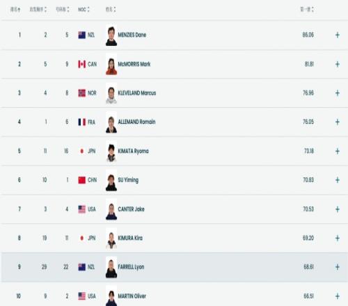 单板滑雪男子坡面障碍技巧预赛第2轮:苏翊鸣获72.78分,暂列第7