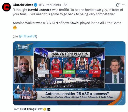 前NBA球员杰夫-蒂格也谈到了伦纳德本赛季的表现,他表示:你们不能说凯文-杜兰特比伦纳德更强。伦纳德处于巅峰状态且健康时,我认为他的水平跟杜兰特是一致的,虽然杜兰特赢得了MVP与FMVP,所以确实有一点差距,但说伦纳德不比他差也不算离谱。我是说,他真的是NBA历史上最顶级的球员之一…… 就是老不打比赛。