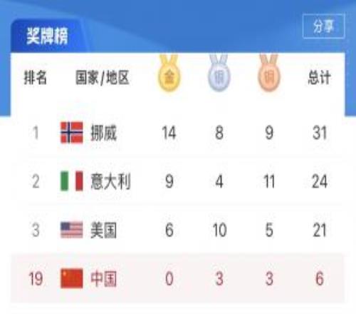 只剩36金!冬奥会奖牌榜:中国3银3铜第19,挪威14金意大利9金