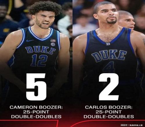 据ESPN报道,在卡梅隆布泽尔目前已出战的26场NCAA比赛里,他已经拿到了5次得分至少25分的两双数据。而他老爹卡洛斯布泽尔在其生涯所代表杜克大学出战的101场比赛里,仅仅拿到两次25+两双。由此可见,卡梅隆布泽尔真的是完美演绎了何谓长江后浪推前浪,一代更比一代强!