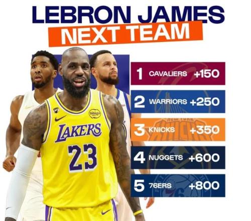 詹姆斯的最新下家赔率也显示,骑士是头号热门下家,排在前五位的依次是骑士(+150)、勇士(+250)、尼克斯(+350)、掘金(+600)和76人(+800)。