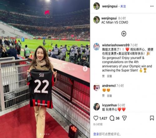 体育播报2月19日宣 今日,花滑名将隋文静在个人社媒晒出自己现身圣西罗球场,观战意甲第24轮AC米兰vs科莫的比赛。她还拿着一件印有自己姓名的米兰22号球衣。