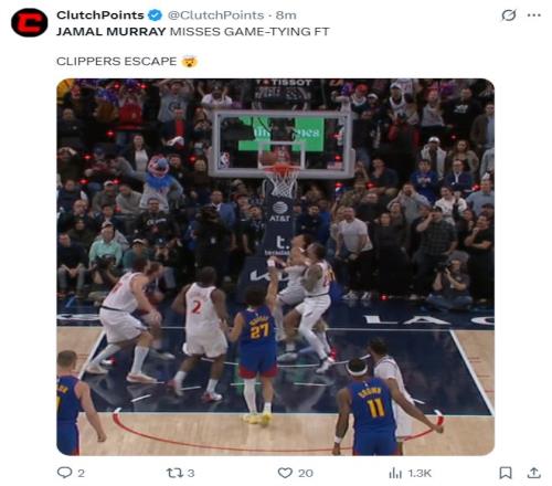 北京时间2月20日,丹佛掘金以114-115被洛杉矶快船逆转。此役掘金一度领先快船10分之多,但掘金核心后卫贾马尔-穆雷15中5+三分5中2效率极差,而且终场前0.9秒他三罚两中未能完成绝平;约基奇22中9+三分6中0+6失误,两个核心表现都不佳,但约基奇末节12分2篮板已经竭尽全力。