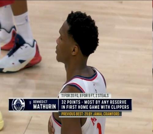 要知道,马瑟林本场比赛轰下的38分(图片中的32分是比赛还未结束时转播方给出的数据)是快船队史在主场首秀得分最多的,超过了贾马尔-克劳福德的29分。