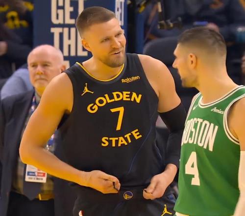 波尔津吉斯曾在23-24赛季跟随绿凯一同夺得NBA总冠军,随后被绿凯放弃,但他与队内很多球员都有着深厚的情感,赛前杰伦-布朗跟波尔津吉斯相谈甚欢,第二节波神获得登场机会,4中2+三分2中1拿到5分1篮板。