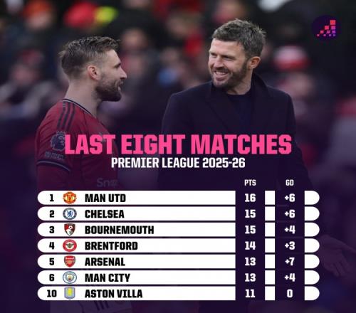 体育播报2月20日宣 Opta统计了各队近8场英超比赛拿到的积分,并列出榜单,曼联16分最多,切尔西、伯恩茅斯15分次席。