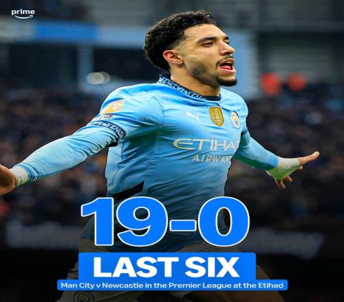 据媒体统计,曼城英超主场对阵纽卡16连胜,近6场打进19球丢0球。