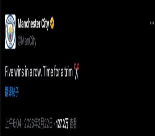 曼城取得各赛事五连胜,俱乐部官方社媒发文调侃曼联球迷蓄发哥:“五连胜,是时候理发了。”