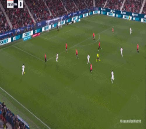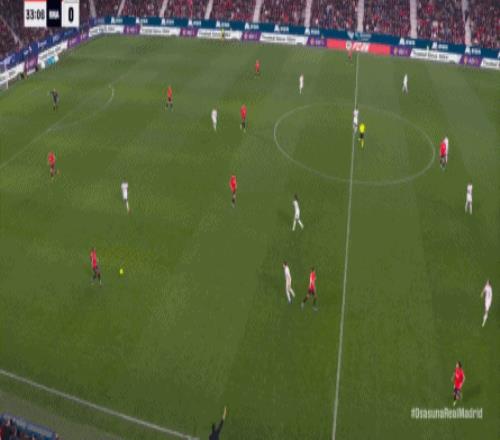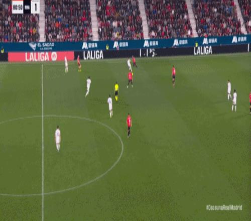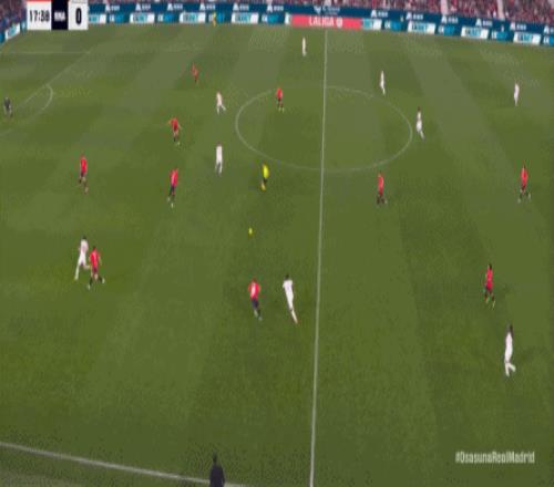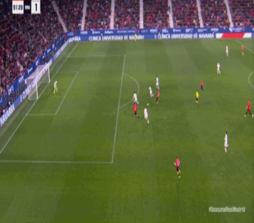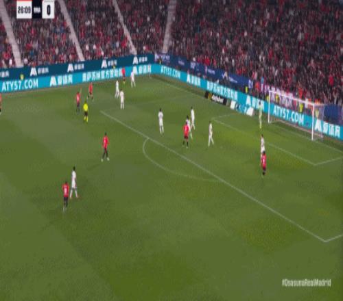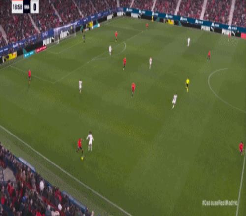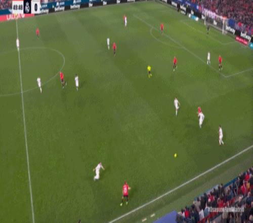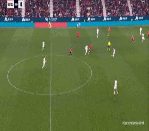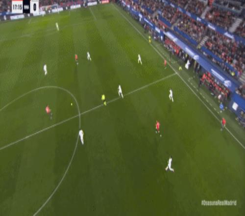 其中一次就是上半场的开分球,在皇马的进攻和逼抢都极其低效的情况下,奥萨苏纳很容易地就能获得起脚空间,就像这次,在边路的处理压力都不大,于是一脚斜长传打到结合部,让皇马付出了点球的代价: