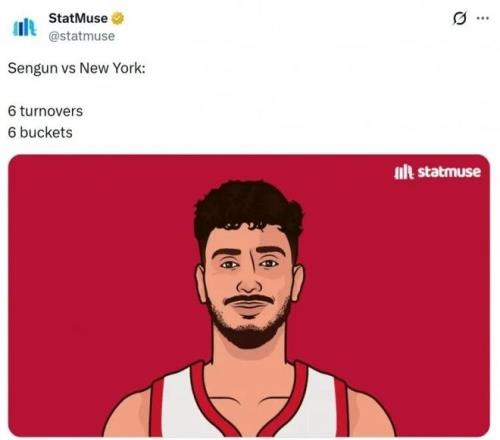 内线核心申京的表现则喜忧参半,全场 12 投 6 中,得到 16 分 6 篮板 6 助攻 3 盖帽,可失误数高达 6 次,美媒 StatMuse 更是直接发文调侃:“申京在纽约的表现:6 个进球、6 次失误。”