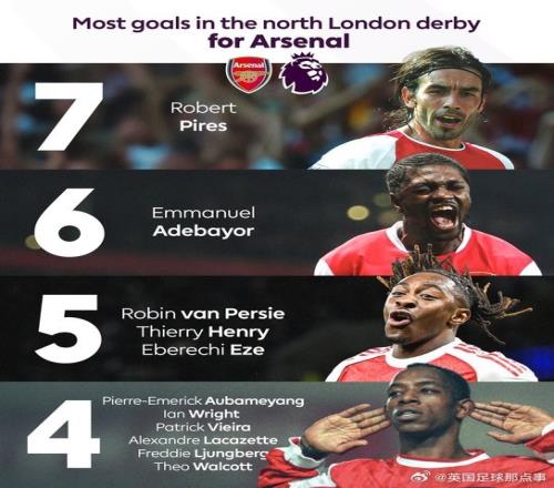 专治热刺!埃泽只踢过两场北伦敦德比,却已经进了5球,在阿森纳历史上,只有两名球员在北伦敦德比的进球比他多↓