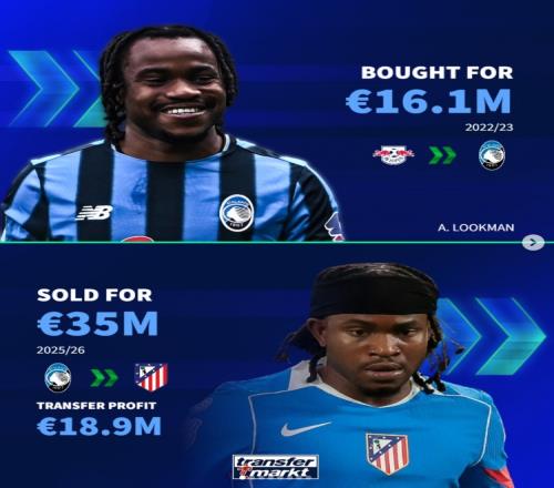 体育播报2月23日宣 亚特兰大前锋卢克曼在冬窗转会马竞,《转会市场》也统计了亚特兰大近年通过低买高卖的盈利操作: