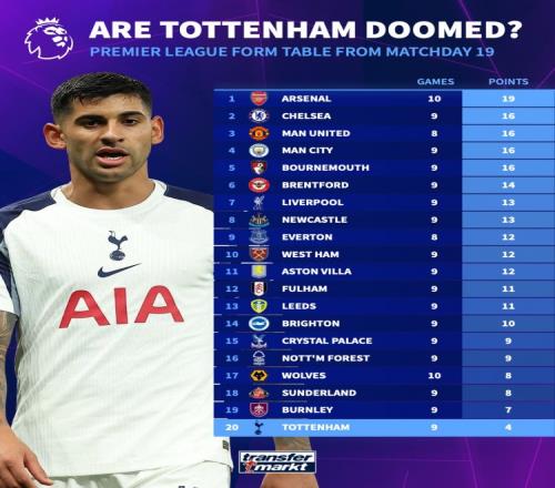 体育播报2月23日宣 德国转会市场统计了英超各队第19轮比赛以来拿到的积分,并列出榜单,阿森纳19分最多,热刺4分垫底。