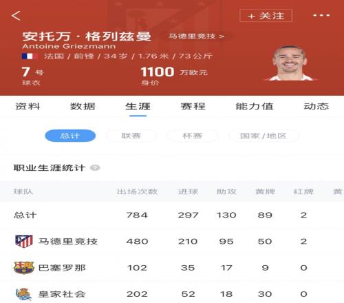 格列兹曼生涯两度效力马竞,目前代表球队出场480次,打进210球送出95次助攻。