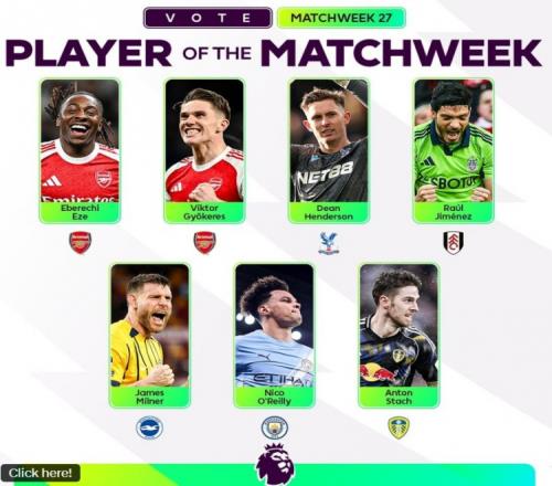 体育播报2月24日宣 英超官方公布了本轮最佳球员候选名单,其中阿森纳两将埃泽、约克雷斯在列,具体如下: