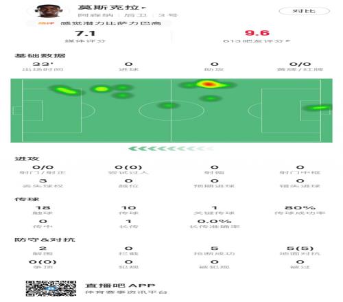 数据统计显示,莫斯克拉在33分钟的出场时间里,就完成了多达5次抢断,并且5次地面对抗全部成功,还贡献了2次解围,防守堪称完美。
