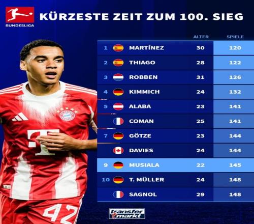 体育播报2月25日宣 在拜仁3-2击败法兰克福之后,穆西亚拉达成生涯100场德甲胜利里程碑,用时145场比赛能够位列历史第9少,以下为最快达成德甲百胜场次榜: