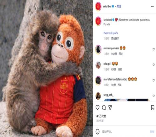 动态的内容是西班牙国家队表达对小猴子Punch的关爱:午夜福利视频导航也爱你,Punch。小猴子Punch是出生在日本千叶县的一家动物园,因被母亲遗弃,一直依赖一个红毛猩猩毛绒玩具寻求安慰,这个故事在全球网络上引发了广泛的同情和关注。