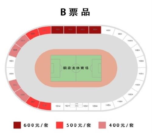 铜梁龙体育场套票分为3档,场次至少5场,分别为400元、500元、600元。