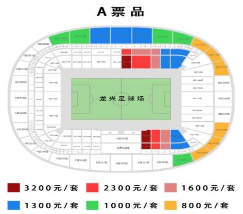 龙兴足球场套票分为6档,场次至少10场,分别为800元、1000元、1300元、1600元、2300元、3200元。