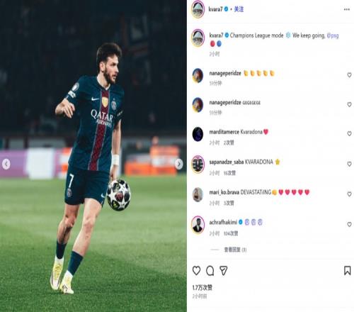 克瓦拉茨赫利亚也在赛后通过社媒晒出自己的比赛照,并配文:“欧冠模式❄️ 午夜福利视频导航继续前进,@巴黎圣日尔曼