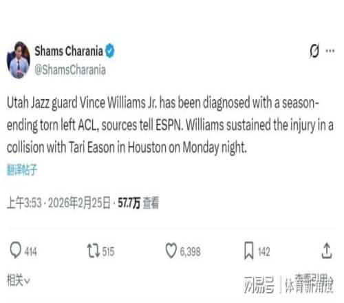 赛后-威廉姆斯接受了核磁共振检查,结果令人痛心——他左膝盖十字韧带撕裂,这不仅意味着他本赛季报销,更可能预示着他职业生涯的终结。文思是2022年选秀大会上的第47顺位新秀,目前正处于新秀合同的最后一年,既未获得提前续约,球队也未流露出续约意向。他原本还想着在赛季末段奋力一搏,争取留队机会,如今却一切成空。