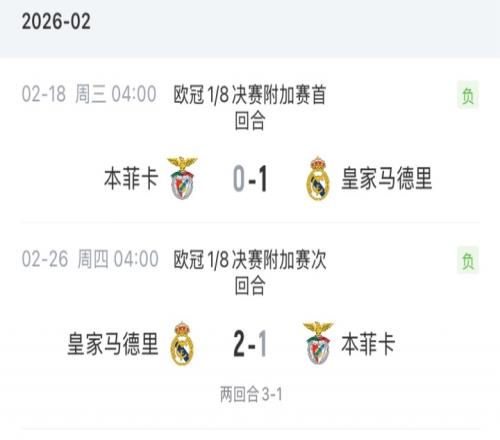 2月26日,欧冠1/8决赛附加赛次回合,本菲卡1-2客负皇马,总比分1-3。