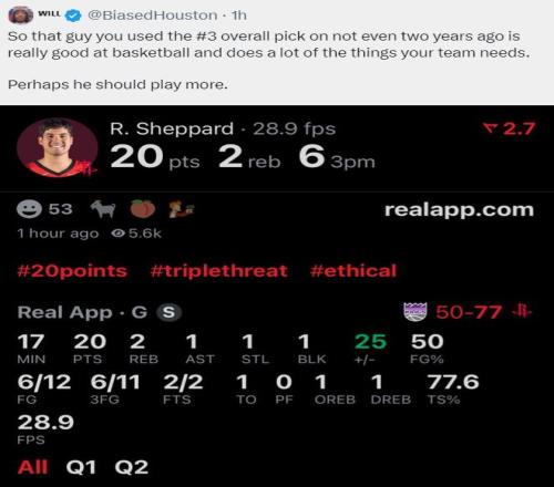 这场比赛里德-谢泼德的发挥很好尤其是上半场,他首节三分4中2拿到8分1篮板1助攻1盖帽,次节三分7中4拿到12分1篮板1抢断,整个上半场他就已经命中6个三分球拿到20分。