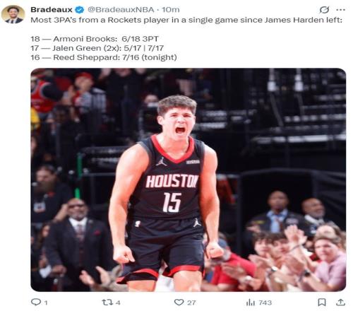4.自哈登离开火箭队后,谢泼德16次三分出手命中7个是队史新高,阿莫尼18次出手6个命中是第二;