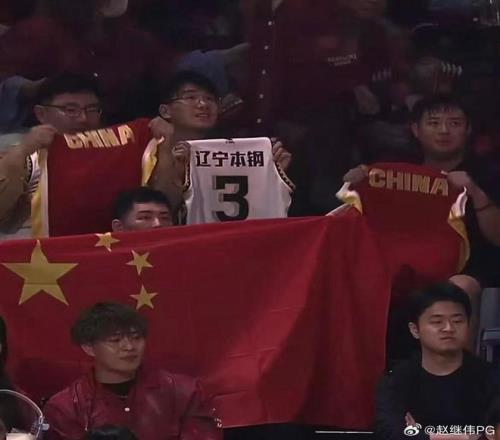 赵继伟发布了中国队的合照,以及比赛场边球迷手持他球衣的照片,并配文:“中国队!嗯!血性还在! ”